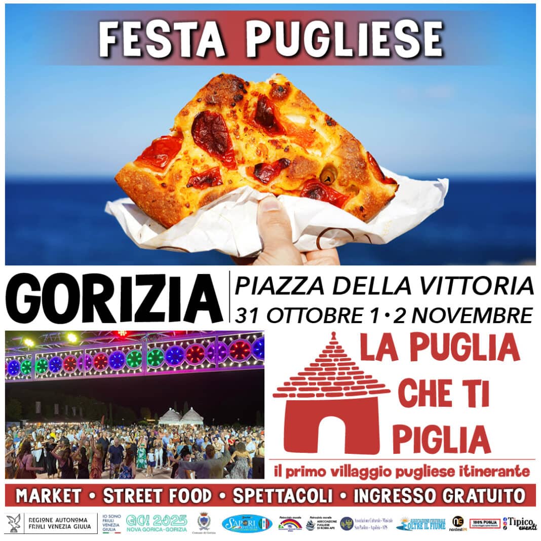 28.10.2025 – 11.25 – Dopo lo sbarco della Sicilia di maggio scorso nel cuore del centro storico di Gorizia, ora sarà la volta della Puglia, con le sue leccornie e le sue tradizioni. Da venerdì 31 ottobre a domenica 2 novembre piazza Vittoria ospiterà “La Puglia che ti piglia”, tappa finale del progetto “Sapori d’Italia – Itinerario FVG 2025. L’iniziativa è ideata dall’associazione culturale musicale San Paolino Aquileia in collaborazione con l’associazione culturale “Oltre il fiume e con la Regione. Enogastronomia, folklore e cultura si intrecceranno nella tre giornate, con l’aria tipica di una festa salentina.